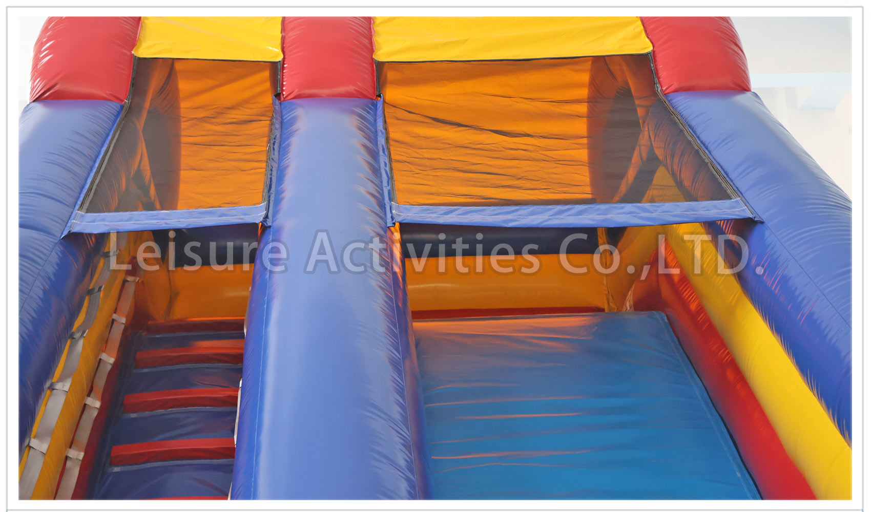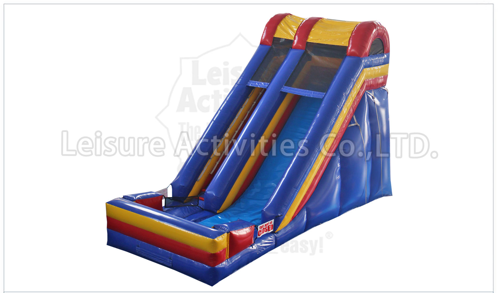 The 18 Screamer Slide is the staple slide of the industry. Our exclusive “No-Jump Top”TM makes this a safe slide because it forces participants to slide down the slide in the proper manner. We have also reinforced all of the stress points with our exclusive Gator MouthTM stress reliefs. This prevents tearing at the wall and floor joints. Tri-fold brochure and business card holder, removable cover sheets, included tie down ropes, and high quality netting are just a few of the built in standards you will find on the nicest slides made for the inflatable industry.